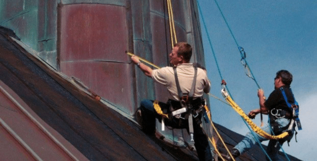 - B. Hash applied a new waterproofing membrane around the steeple and new copper flashing around the steeple base. They then installed new custom-cut copper cladding fabricated on-site.