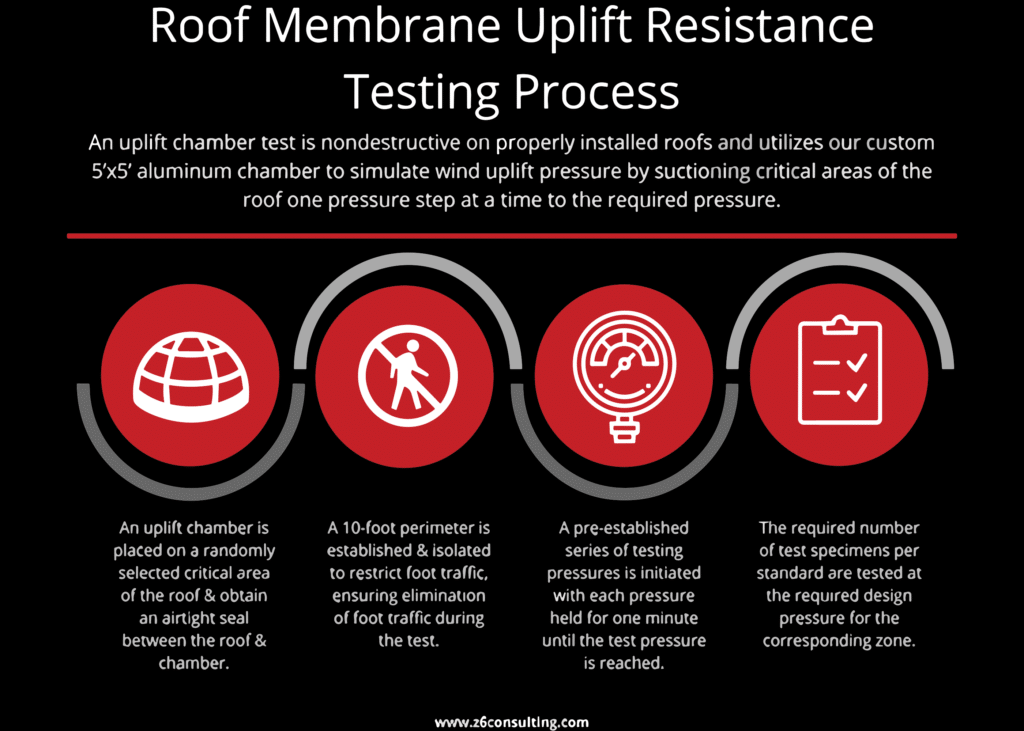The goal of roof uplift testing is to measure the upward force (caused by wind) your building’s roof is capable of withstanding. While several protocols are used, the test method applies to those with or without rigid board insulation or base ply, which are either adhered or mechanically fastened, and fully adhered membranes.