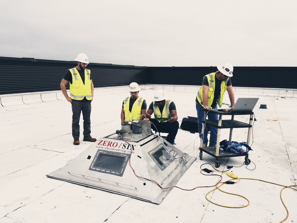 Low Voltage Vector Mapping requires a wet surface which makes it the method-of-choice for green roofs and/or rainy days. Wet surfaces create a conductive medium over the entire surface of the roof. A trace wire is applied to the perimeter of the roof area to be tested. This trace wire is then connected to a pulse generator. From the pulse generator, a ground wire is connected to a penetration in the structural roof deck to complete the circuit covering the testing area. The penetrations and drains in the roof system are then isolated and connected to the perimeter trace wire. The roof membrane acts as a barrier between the electrical circuit. If there are any breaches in the roofing membrane, current will flow through this breech and connect the circuit, detected by a trained Z6 technician utilizing a receiver and a set of probes. The technician traces the sensor’s direction until all breaches are identified.